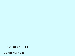 Hex #d5fcff Color is a very light cyan color and the nearest color is Oyster Bay #dafaff. Hex code #d5fcff and RGB value is rgb(213,252,255). In RGB color space, this color is composed of 84% red, 99% green, 100% blue, In CMYK color space, this color is composed of 16% cyan, 1% magenta, 0% yellow , 0% black , In HSL color space, this color has a hue angle of 184° , 100% saturation and 92% lightness.