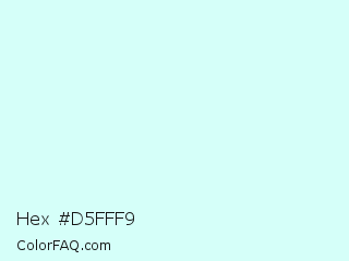 Hex #d5fff9 Color is a very light cyan color and the nearest color is Foam #d8fcfa. Hex code #d5fff9 and RGB value is rgb(213,255,249). In RGB color space, this color is composed of 84% red, 100% green, 98% blue, In CMYK color space, this color is composed of 16% cyan, 0% magenta, 2% yellow , 0% black , In HSL color space, this color has a hue angle of 171° , 100% saturation and 92% lightness.