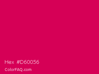 Hex #d60056 Color is a normal rose color and the nearest color is Rubine Red #d10056. Hex code #d60056 and RGB value is rgb(214,0,86). In RGB color space, this color is composed of 84% red, 0% green, 34% blue, In CMYK color space, this color is composed of 0% cyan, 100% magenta, 60% yellow , 16% black , In HSL color space, this color has a hue angle of 336° , 100% saturation and 42% lightness.