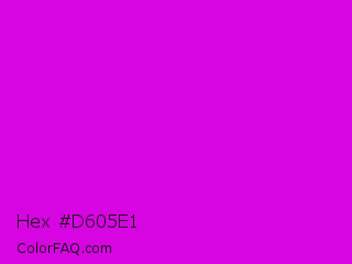 Hex #d605e1 Color is a normal magenta color and the nearest color is Deep Magenta #cc00cc. Hex code #d605e1 and RGB value is rgb(214,5,225). In RGB color space, this color is composed of 84% red, 2% green, 88% blue, In CMYK color space, this color is composed of 5% cyan, 98% magenta, 0% yellow , 12% black , In HSL color space, this color has a hue angle of 297° , 96% saturation and 45% lightness.