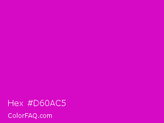 Hex #d60ac5 Color is a normal magenta color and the nearest color is Deep Magenta #cc00cc. Hex code #d60ac5 and RGB value is rgb(214,10,197). In RGB color space, this color is composed of 84% red, 4% green, 77% blue, In CMYK color space, this color is composed of 0% cyan, 95% magenta, 8% yellow , 16% black , In HSL color space, this color has a hue angle of 305° , 91% saturation and 44% lightness.