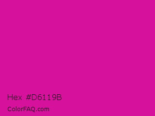 Hex #d6119b Color is a normal magenta color and the nearest color is Barbie Pink #e0218a. Hex code #d6119b and RGB value is rgb(214,17,155). In RGB color space, this color is composed of 84% red, 7% green, 61% blue, In CMYK color space, this color is composed of 0% cyan, 92% magenta, 28% yellow , 16% black , In HSL color space, this color has a hue angle of 318° , 85% saturation and 45% lightness.