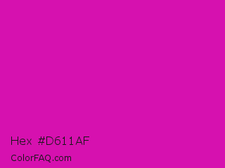 Hex #d611af Color is a normal magenta color and the nearest color is Deep Magenta #cc00cc. Hex code #d611af and RGB value is rgb(214,17,175). In RGB color space, this color is composed of 84% red, 7% green, 69% blue, In CMYK color space, this color is composed of 0% cyan, 92% magenta, 18% yellow , 16% black , In HSL color space, this color has a hue angle of 312° , 85% saturation and 45% lightness.