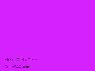 Hex #d621ff Color is a normal purple color and the nearest color is Phlox #df00ff. Hex code #d621ff and RGB value is rgb(214,33,255). In RGB color space, this color is composed of 84% red, 13% green, 100% blue, In CMYK color space, this color is composed of 16% cyan, 87% magenta, 0% yellow , 0% black , In HSL color space, this color has a hue angle of 289° , 100% saturation and 56% lightness.