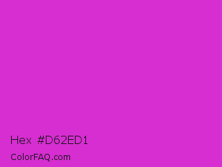 Hex #d62ed1 Color is a normal magenta color and the nearest color is Steel Pink #cc33cc. Hex code #d62ed1 and RGB value is rgb(214,46,209). In RGB color space, this color is composed of 84% red, 18% green, 82% blue, In CMYK color space, this color is composed of 0% cyan, 79% magenta, 2% yellow , 16% black , In HSL color space, this color has a hue angle of 302° , 67% saturation and 51% lightness.