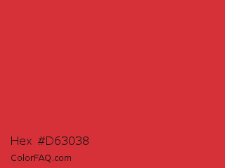 Hex #d63038 Color is a normal red color and the nearest color is Madder Lake #cc3336. Hex code #d63038 and RGB value is rgb(214,48,56). In RGB color space, this color is composed of 84% red, 19% green, 22% blue, In CMYK color space, this color is composed of 0% cyan, 78% magenta, 74% yellow , 16% black , In HSL color space, this color has a hue angle of 357° , 67% saturation and 51% lightness.