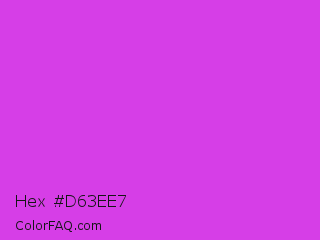 Hex #d63ee7 Color is a normal magenta color and the nearest color is Steel Pink #cc33cc. Hex code #d63ee7 and RGB value is rgb(214,62,231). In RGB color space, this color is composed of 84% red, 24% green, 91% blue, In CMYK color space, this color is composed of 7% cyan, 73% magenta, 0% yellow , 9% black , In HSL color space, this color has a hue angle of 294° , 78% saturation and 57% lightness.