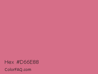 Hex #d66e88 Color is a light red color and the nearest color is Pale Red Violet #db7093. Hex code #d66e88 and RGB value is rgb(214,110,136). In RGB color space, this color is composed of 84% red, 43% green, 53% blue, In CMYK color space, this color is composed of 0% cyan, 49% magenta, 36% yellow , 16% black , In HSL color space, this color has a hue angle of 345° , 56% saturation and 64% lightness.