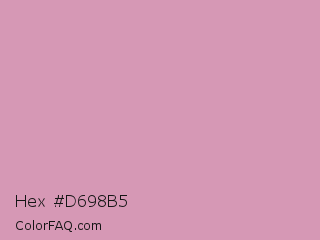 Hex #d698b5 Color is a light rose color and the nearest color is Careys Pink #d29eaa. Hex code #d698b5 and RGB value is rgb(214,152,181). In RGB color space, this color is composed of 84% red, 60% green, 71% blue, In CMYK color space, this color is composed of 0% cyan, 29% magenta, 15% yellow , 16% black , In HSL color space, this color has a hue angle of 332° , 43% saturation and 72% lightness.