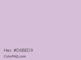 Hex #d6bed9 Color is a light magenta color and the nearest color is Thistle #d8bfd8. Hex code #d6bed9 and RGB value is rgb(214,190,217). In RGB color space, this color is composed of 84% red, 75% green, 85% blue, In CMYK color space, this color is composed of 1% cyan, 12% magenta, 0% yellow , 15% black , In HSL color space, this color has a hue angle of 293° , 26% saturation and 80% lightness.
