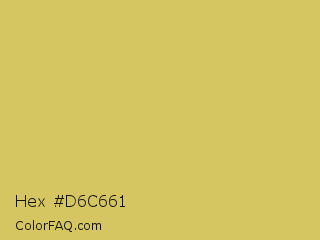 Hex #d6c661 Color is a light yellow color and the nearest color is Tacha #d6c562. Hex code #d6c661 and RGB value is rgb(214,198,97). In RGB color space, this color is composed of 84% red, 78% green, 38% blue, In CMYK color space, this color is composed of 0% cyan, 7% magenta, 55% yellow , 16% black , In HSL color space, this color has a hue angle of 52° , 59% saturation and 61% lightness.