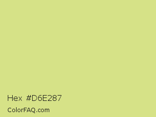 Hex #d6e287 Color is a light yellow color and the nearest color is Medium Spring Bud #c9dc87. Hex code #d6e287 and RGB value is rgb(214,226,135). In RGB color space, this color is composed of 84% red, 89% green, 53% blue, In CMYK color space, this color is composed of 5% cyan, 0% magenta, 40% yellow , 11% black , In HSL color space, this color has a hue angle of 68° , 61% saturation and 71% lightness.