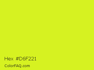 Hex #d6f221 Color is a normal yellow color and the nearest color is Arctic Lime #d0ff14. Hex code #d6f221 and RGB value is rgb(214,242,33). In RGB color space, this color is composed of 84% red, 95% green, 13% blue, In CMYK color space, this color is composed of 12% cyan, 0% magenta, 86% yellow , 5% black , In HSL color space, this color has a hue angle of 68° , 89% saturation and 54% lightness.