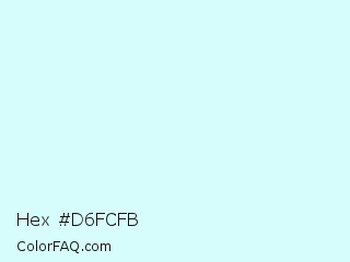 Hex #d6fcfb Color is a very light cyan color and the nearest color is Foam #d8fcfa. Hex code #d6fcfb and RGB value is rgb(214,252,251). In RGB color space, this color is composed of 84% red, 99% green, 98% blue, In CMYK color space, this color is composed of 15% cyan, 0% magenta, 0% yellow , 1% black , In HSL color space, this color has a hue angle of 178° , 86% saturation and 91% lightness.