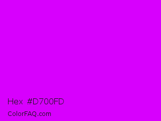 Hex #d700fd Color is a normal purple color and the nearest color is Phlox #df00ff. Hex code #d700fd and RGB value is rgb(215,0,253). In RGB color space, this color is composed of 84% red, 0% green, 99% blue, In CMYK color space, this color is composed of 15% cyan, 100% magenta, 0% yellow , 1% black , In HSL color space, this color has a hue angle of 291° , 100% saturation and 50% lightness.