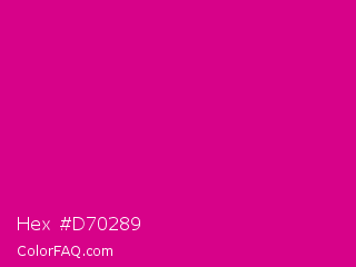 Hex #d70289 Color is a normal magenta color and the nearest color is Mexican Pink #e4007c. Hex code #d70289 and RGB value is rgb(215,2,137). In RGB color space, this color is composed of 84% red, 1% green, 54% blue, In CMYK color space, this color is composed of 0% cyan, 99% magenta, 36% yellow , 16% black , In HSL color space, this color has a hue angle of 322° , 98% saturation and 43% lightness.
