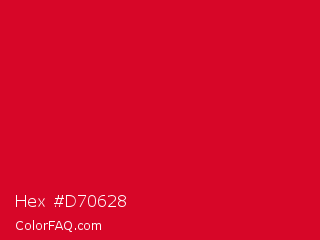 Hex #d70628 Color is a normal red color and the nearest color is Medium Candy Apple Red #e2062c. Hex code #d70628 and RGB value is rgb(215,6,40). In RGB color space, this color is composed of 84% red, 2% green, 16% blue, In CMYK color space, this color is composed of 0% cyan, 97% magenta, 81% yellow , 16% black , In HSL color space, this color has a hue angle of 350° , 95% saturation and 43% lightness.