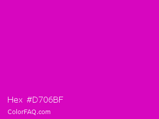Hex #d706bf Color is a normal magenta color and the nearest color is Deep Magenta #cc00cc. Hex code #d706bf and RGB value is rgb(215,6,191). In RGB color space, this color is composed of 84% red, 2% green, 75% blue, In CMYK color space, this color is composed of 0% cyan, 97% magenta, 11% yellow , 16% black , In HSL color space, this color has a hue angle of 307° , 95% saturation and 43% lightness.