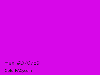 Hex #d707e9 Color is a normal magenta color and the nearest color is Phlox #df00ff. Hex code #d707e9 and RGB value is rgb(215,7,233). In RGB color space, this color is composed of 84% red, 3% green, 91% blue, In CMYK color space, this color is composed of 8% cyan, 97% magenta, 0% yellow , 9% black , In HSL color space, this color has a hue angle of 295° , 94% saturation and 47% lightness.