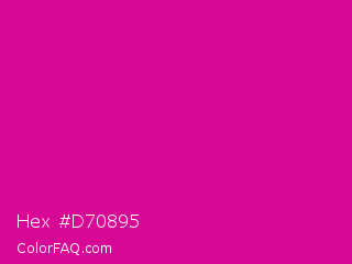 Hex #d70895 Color is a normal magenta color and the nearest color is Red Violet #c71585. Hex code #d70895 and RGB value is rgb(215,8,149). In RGB color space, this color is composed of 84% red, 3% green, 58% blue, In CMYK color space, this color is composed of 0% cyan, 96% magenta, 31% yellow , 16% black , In HSL color space, this color has a hue angle of 319° , 93% saturation and 44% lightness.