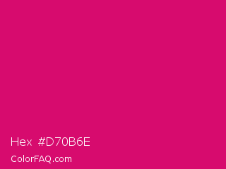 Hex #d70b6e Color is a normal rose color and the nearest color is Dogwood Rose #d71868. Hex code #d70b6e and RGB value is rgb(215,11,110). In RGB color space, this color is composed of 84% red, 4% green, 43% blue, In CMYK color space, this color is composed of 0% cyan, 95% magenta, 49% yellow , 16% black , In HSL color space, this color has a hue angle of 331° , 90% saturation and 44% lightness.