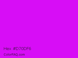 Hex #d70df6 Color is a normal magenta color and the nearest color is Phlox #df00ff. Hex code #d70df6 and RGB value is rgb(215,13,246). In RGB color space, this color is composed of 84% red, 5% green, 96% blue, In CMYK color space, this color is composed of 13% cyan, 95% magenta, 0% yellow , 4% black , In HSL color space, this color has a hue angle of 292° , 93% saturation and 51% lightness.