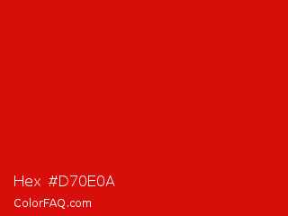 Hex #d70e0a Color is a normal red color and the nearest color is Rosso Corsa #d40000. Hex code #d70e0a and RGB value is rgb(215,14,10). In RGB color space, this color is composed of 84% red, 5% green, 4% blue, In CMYK color space, this color is composed of 0% cyan, 93% magenta, 95% yellow , 16% black , In HSL color space, this color has a hue angle of 1° , 91% saturation and 44% lightness.
