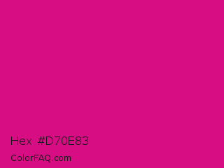 Hex #d70e83 Color is a normal magenta color and the nearest color is Vivid Cerise #da1d81. Hex code #d70e83 and RGB value is rgb(215,14,131). In RGB color space, this color is composed of 84% red, 5% green, 51% blue, In CMYK color space, this color is composed of 0% cyan, 93% magenta, 39% yellow , 16% black , In HSL color space, this color has a hue angle of 325° , 88% saturation and 45% lightness.