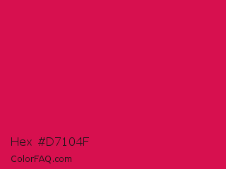 Hex #d7104f Color is a normal rose color and the nearest color is Debian Red #d70a53. Hex code #d7104f and RGB value is rgb(215,16,79). In RGB color space, this color is composed of 84% red, 6% green, 31% blue, In CMYK color space, this color is composed of 0% cyan, 93% magenta, 63% yellow , 16% black , In HSL color space, this color has a hue angle of 341° , 86% saturation and 45% lightness.