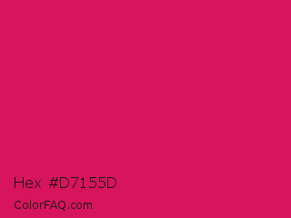 Hex #d7155d Color is a normal rose color and the nearest color is Ruby #e0115f. Hex code #d7155d and RGB value is rgb(215,21,93). In RGB color space, this color is composed of 84% red, 8% green, 36% blue, In CMYK color space, this color is composed of 0% cyan, 90% magenta, 57% yellow , 16% black , In HSL color space, this color has a hue angle of 338° , 82% saturation and 46% lightness.