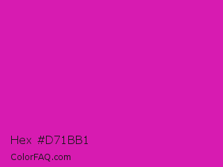 Hex #d71bb1 Color is a normal magenta color and the nearest color is Frostbite #e936a7. Hex code #d71bb1 and RGB value is rgb(215,27,177). In RGB color space, this color is composed of 84% red, 11% green, 69% blue, In CMYK color space, this color is composed of 0% cyan, 87% magenta, 18% yellow , 16% black , In HSL color space, this color has a hue angle of 312° , 78% saturation and 47% lightness.