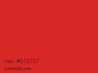 Hex #d72727 Color is a normal red color and the nearest color is Maximum Red #d92121. Hex code #d72727 and RGB value is rgb(215,39,39). In RGB color space, this color is composed of 84% red, 15% green, 15% blue, In CMYK color space, this color is composed of 0% cyan, 82% magenta, 82% yellow , 16% black , In HSL color space, this color has a hue angle of 0° , 69% saturation and 50% lightness.