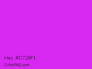 Hex #d728f1 Color is a normal magenta color and the nearest color is Steel Pink #cc33cc. Hex code #d728f1 and RGB value is rgb(215,40,241). In RGB color space, this color is composed of 84% red, 16% green, 95% blue, In CMYK color space, this color is composed of 11% cyan, 83% magenta, 0% yellow , 5% black , In HSL color space, this color has a hue angle of 292° , 88% saturation and 55% lightness.