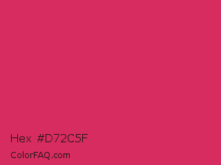 Hex #d72c5f Color is a normal rose color and the nearest color is Cerise Red #de3163. Hex code #d72c5f and RGB value is rgb(215,44,95). In RGB color space, this color is composed of 84% red, 17% green, 37% blue, In CMYK color space, this color is composed of 0% cyan, 80% magenta, 56% yellow , 16% black , In HSL color space, this color has a hue angle of 342° , 68% saturation and 51% lightness.