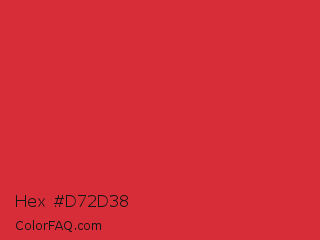 Hex #d72d38 Color is a normal red color and the nearest color is Rusty Red #da2c43. Hex code #d72d38 and RGB value is rgb(215,45,56). In RGB color space, this color is composed of 84% red, 18% green, 22% blue, In CMYK color space, this color is composed of 0% cyan, 79% magenta, 74% yellow , 16% black , In HSL color space, this color has a hue angle of 356° , 68% saturation and 51% lightness.