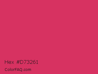 Hex #d73261 Color is a normal rose color and the nearest color is Cerise Red #de3163. Hex code #d73261 and RGB value is rgb(215,50,97). In RGB color space, this color is composed of 84% red, 20% green, 38% blue, In CMYK color space, this color is composed of 0% cyan, 77% magenta, 55% yellow , 16% black , In HSL color space, this color has a hue angle of 343° , 67% saturation and 52% lightness.