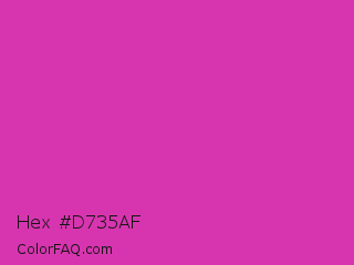 Hex #d735af Color is a normal magenta color and the nearest color is Frostbite #e936a7. Hex code #d735af and RGB value is rgb(215,53,175). In RGB color space, this color is composed of 84% red, 21% green, 69% blue, In CMYK color space, this color is composed of 0% cyan, 75% magenta, 19% yellow , 16% black , In HSL color space, this color has a hue angle of 315° , 67% saturation and 53% lightness.