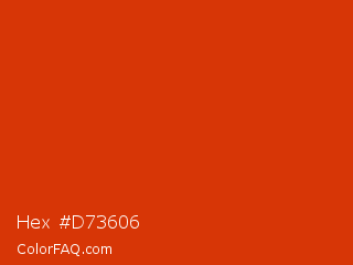 Hex #d73606 Color is a normal red color and the nearest color is Sinopia #cb410b. Hex code #d73606 and RGB value is rgb(215,54,6). In RGB color space, this color is composed of 84% red, 21% green, 2% blue, In CMYK color space, this color is composed of 0% cyan, 75% magenta, 97% yellow , 16% black , In HSL color space, this color has a hue angle of 14° , 95% saturation and 43% lightness.