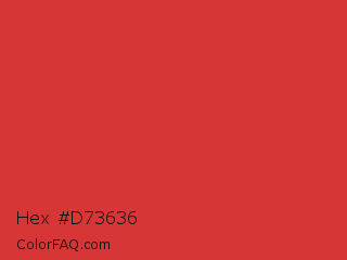 Hex #d73636 Color is a normal red color and the nearest color is Jasper #d73b3e. Hex code #d73636 and RGB value is rgb(215,54,54). In RGB color space, this color is composed of 84% red, 21% green, 21% blue, In CMYK color space, this color is composed of 0% cyan, 75% magenta, 75% yellow , 16% black , In HSL color space, this color has a hue angle of 0° , 67% saturation and 53% lightness.