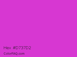 Hex #d737d2 Color is a normal magenta color and the nearest color is Steel Pink #cc33cc. Hex code #d737d2 and RGB value is rgb(215,55,210). In RGB color space, this color is composed of 84% red, 22% green, 82% blue, In CMYK color space, this color is composed of 0% cyan, 74% magenta, 2% yellow , 16% black , In HSL color space, this color has a hue angle of 302° , 67% saturation and 53% lightness.