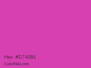 Hex #d740b1 Color is a normal magenta color and the nearest color is Frostbite #e936a7. Hex code #d740b1 and RGB value is rgb(215,64,177). In RGB color space, this color is composed of 84% red, 25% green, 69% blue, In CMYK color space, this color is composed of 0% cyan, 70% magenta, 18% yellow , 16% black , In HSL color space, this color has a hue angle of 315° , 65% saturation and 55% lightness.