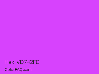 Hex #d742fd Color is a light purple color and the nearest color is Heliotrope #df73ff. Hex code #d742fd and RGB value is rgb(215,66,253). In RGB color space, this color is composed of 84% red, 26% green, 99% blue, In CMYK color space, this color is composed of 15% cyan, 74% magenta, 0% yellow , 1% black , In HSL color space, this color has a hue angle of 288° , 98% saturation and 63% lightness.