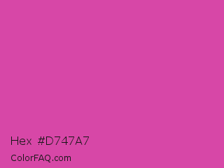 Hex #d747a7 Color is a normal magenta color and the nearest color is Pink Pantone #d74894. Hex code #d747a7 and RGB value is rgb(215,71,167). In RGB color space, this color is composed of 84% red, 28% green, 65% blue, In CMYK color space, this color is composed of 0% cyan, 67% magenta, 22% yellow , 16% black , In HSL color space, this color has a hue angle of 320° , 64% saturation and 56% lightness.