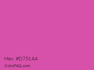 Hex #d751aa Color is a normal magenta color and the nearest color is Raspberry Pink #e25098. Hex code #d751aa and RGB value is rgb(215,81,170). In RGB color space, this color is composed of 84% red, 32% green, 67% blue, In CMYK color space, this color is composed of 0% cyan, 62% magenta, 21% yellow , 16% black , In HSL color space, this color has a hue angle of 320° , 63% saturation and 58% lightness.