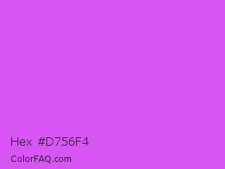 Hex #d756f4 Color is a light purple color and the nearest color is Heliotrope #df73ff. Hex code #d756f4 and RGB value is rgb(215,86,244). In RGB color space, this color is composed of 84% red, 34% green, 96% blue, In CMYK color space, this color is composed of 12% cyan, 65% magenta, 0% yellow , 4% black , In HSL color space, this color has a hue angle of 289° , 88% saturation and 65% lightness.