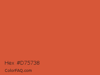 Hex #d75738 Color is a normal red color and the nearest color is Flame Pea #da5b38. Hex code #d75738 and RGB value is rgb(215,87,56). In RGB color space, this color is composed of 84% red, 34% green, 22% blue, In CMYK color space, this color is composed of 0% cyan, 60% magenta, 74% yellow , 16% black , In HSL color space, this color has a hue angle of 12° , 67% saturation and 53% lightness.