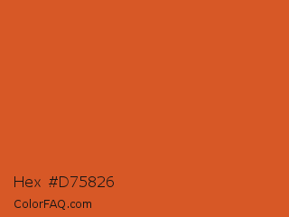 Hex #d75826 Color is a normal orange color and the nearest color is Flame #e25822. Hex code #d75826 and RGB value is rgb(215,88,38). In RGB color space, this color is composed of 84% red, 35% green, 15% blue, In CMYK color space, this color is composed of 0% cyan, 59% magenta, 82% yellow , 16% black , In HSL color space, this color has a hue angle of 17° , 70% saturation and 50% lightness.