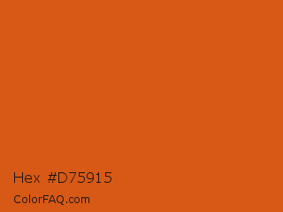 Hex #d75915 Color is a normal orange color and the nearest color is Flame #e25822. Hex code #d75915 and RGB value is rgb(215,89,21). In RGB color space, this color is composed of 84% red, 35% green, 8% blue, In CMYK color space, this color is composed of 0% cyan, 59% magenta, 90% yellow , 16% black , In HSL color space, this color has a hue angle of 21° , 82% saturation and 46% lightness.