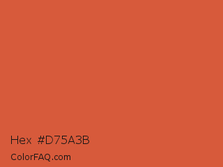 Hex #d75a3b Color is a normal red color and the nearest color is Flame Pea #da5b38. Hex code #d75a3b and RGB value is rgb(215,90,59). In RGB color space, this color is composed of 84% red, 35% green, 23% blue, In CMYK color space, this color is composed of 0% cyan, 58% magenta, 73% yellow , 16% black , In HSL color space, this color has a hue angle of 12° , 66% saturation and 54% lightness.