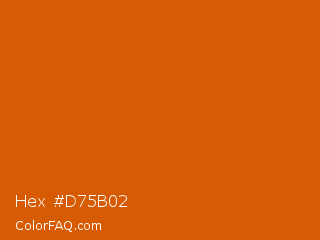 Hex #d75b02 Color is a normal orange color and the nearest color is Red Stage #d05f04. Hex code #d75b02 and RGB value is rgb(215,91,2). In RGB color space, this color is composed of 84% red, 36% green, 1% blue, In CMYK color space, this color is composed of 0% cyan, 58% magenta, 99% yellow , 16% black , In HSL color space, this color has a hue angle of 25° , 98% saturation and 43% lightness.